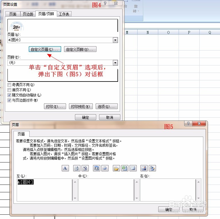 步骤3:单击“自定义页眉”选项(如下图4)后,将弹出下图(图5)对话框。