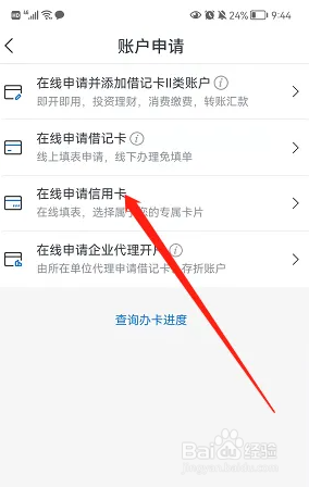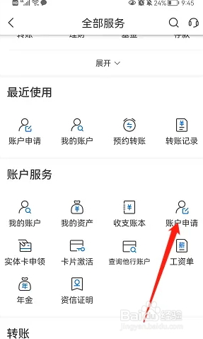 2.进入全部服务界囊躲面—选择账户服务—点击案近肺账户申请—点击在线申请信用卡