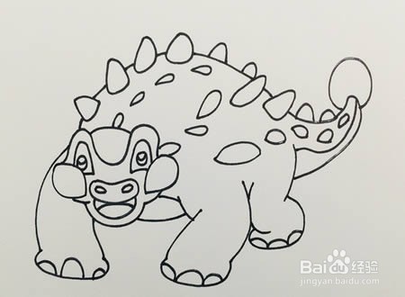 第三步: 再画出甲龙的背部,背部高高隆起,在背部上画上大小不一的尖刺,一直延伸到尾巴处,尾巴细长。