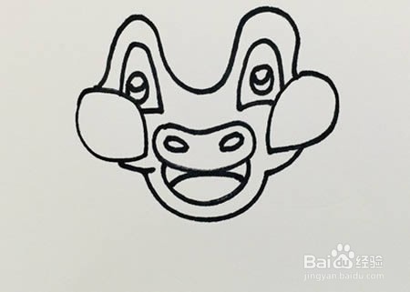 第一步:首先画出甲龙的面部,接着画出大大的眼睛,鼻子和嘴巴是连在一起的,画出鼻孔和石头,脸颊两侧画两个椭圆。