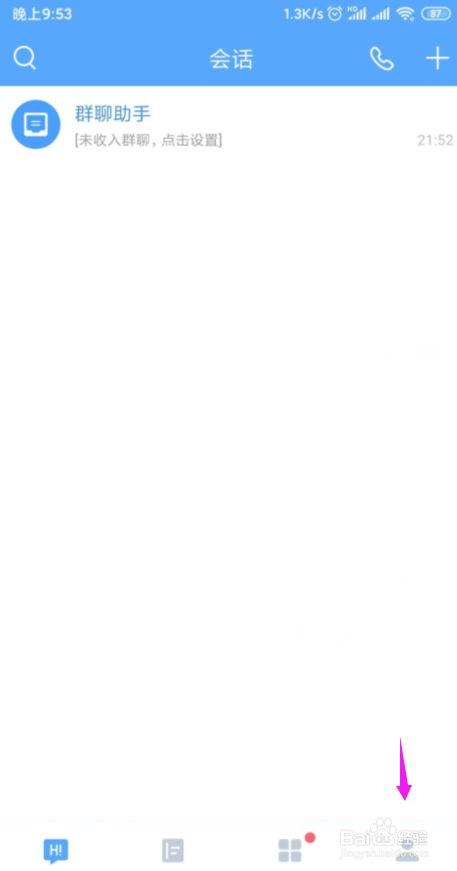1、要关闭群聊助手功能,点按开【百度Hi】下方的人头像。