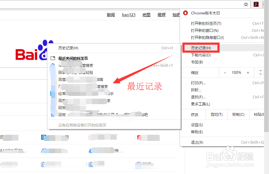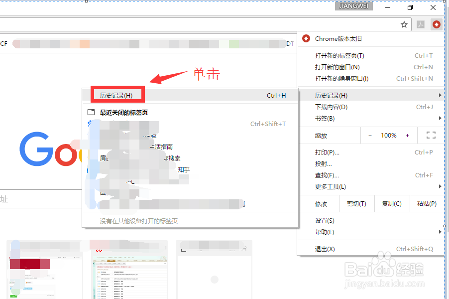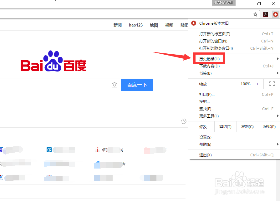 单击浏览器的自定义及控制,进入到浏览器的相关设置和查找界面。找到并单击历史记录。