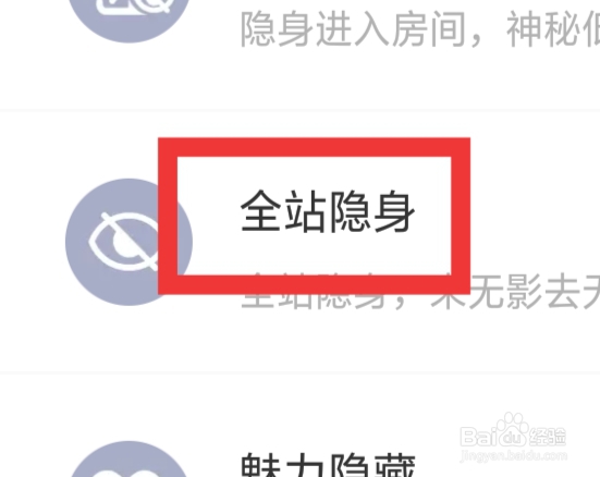 第三步,选择【全站隐身】这个选项,点击这个选项进入设置就可以了;
