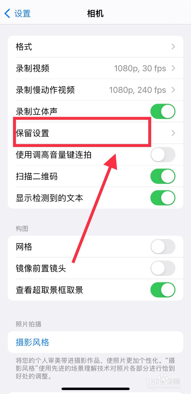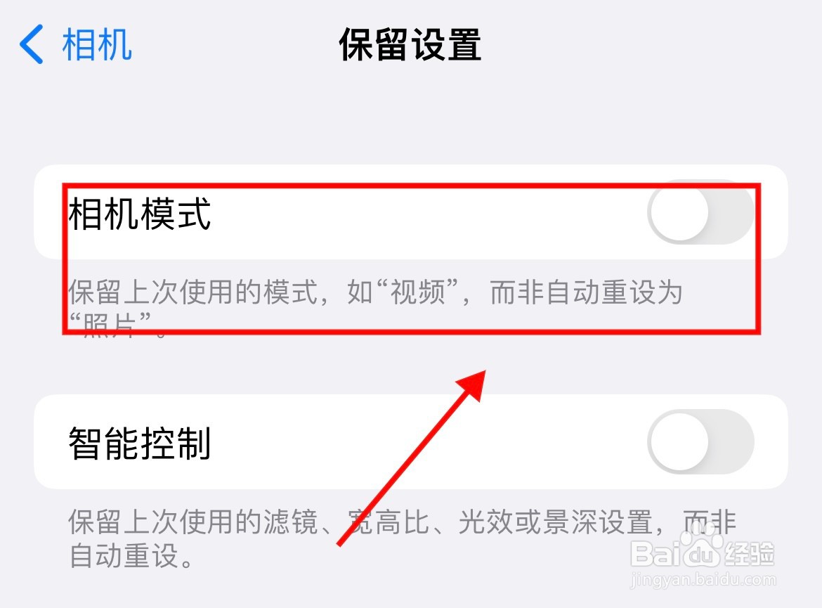 进入保留设置页面,将“相机模式”后面的功能键关闭,则退出相机后再次打开会默认是照片模式