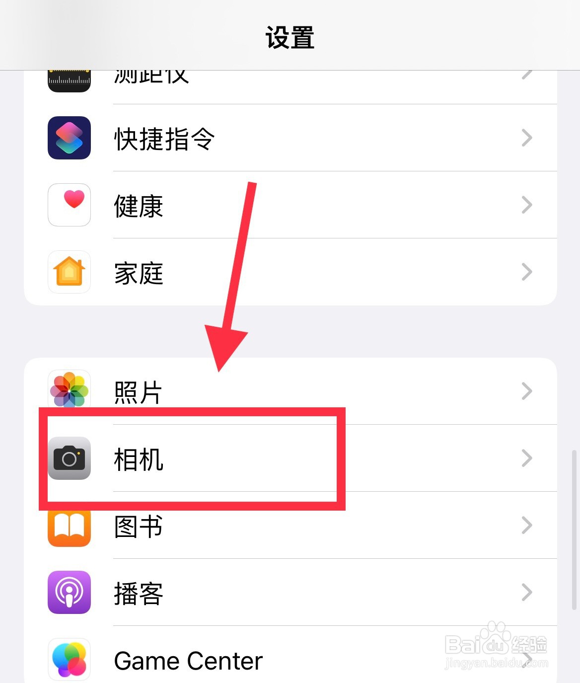 苹果手机点击桌面设置图标进入设置页面后点击“相机”