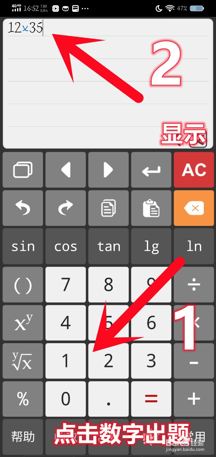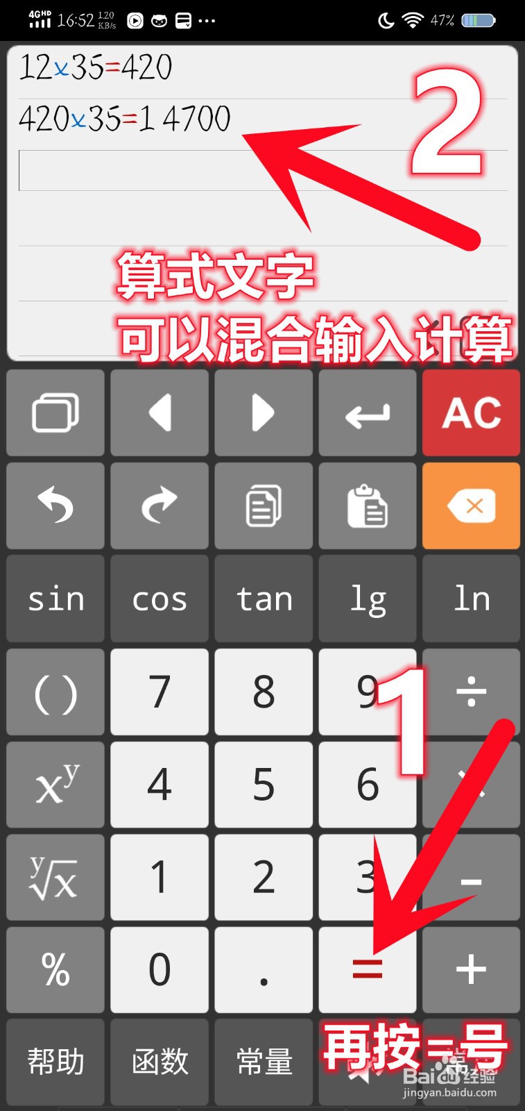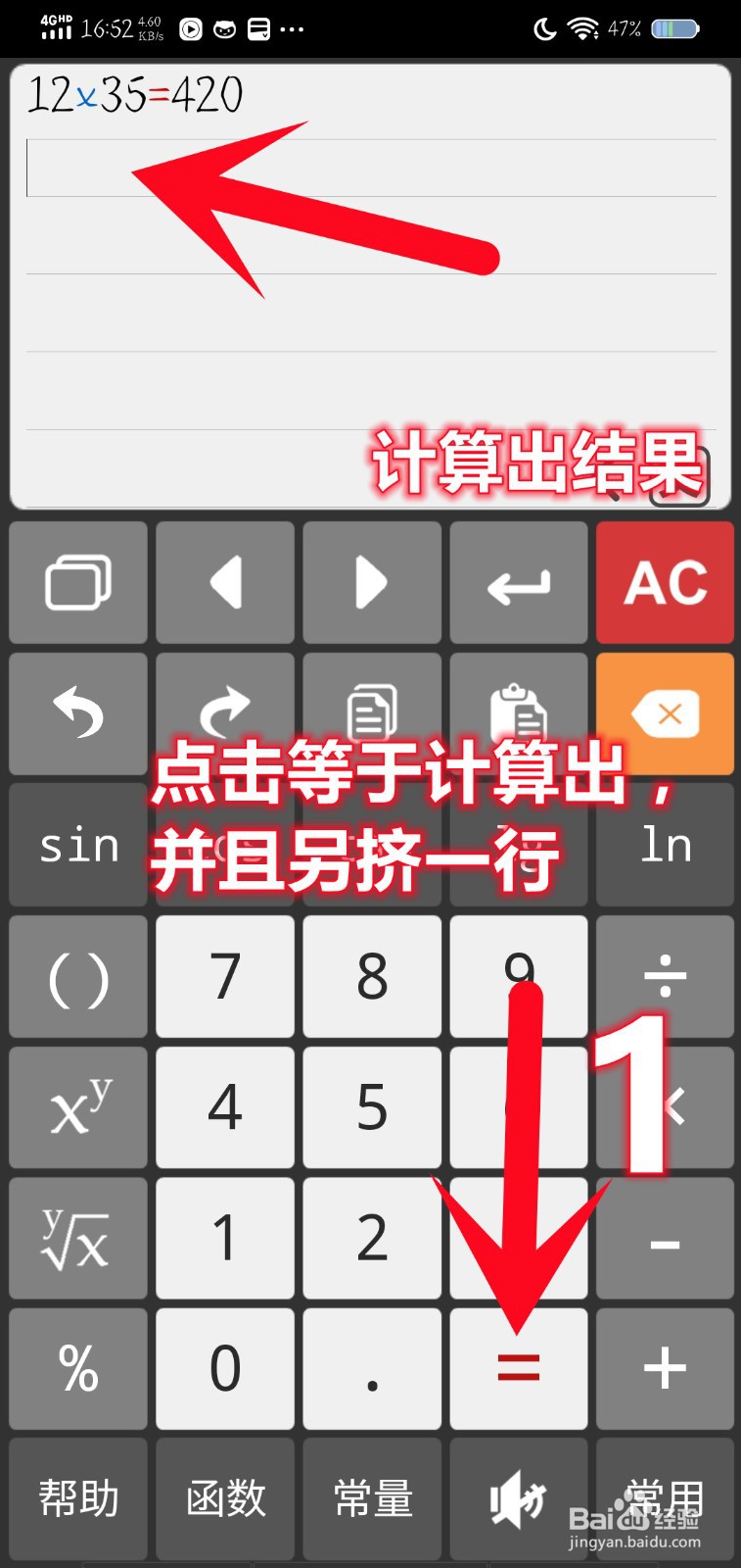 输入12X35算出,并且自动另挤一行,再按=号,算式文字可以混合输入计算。