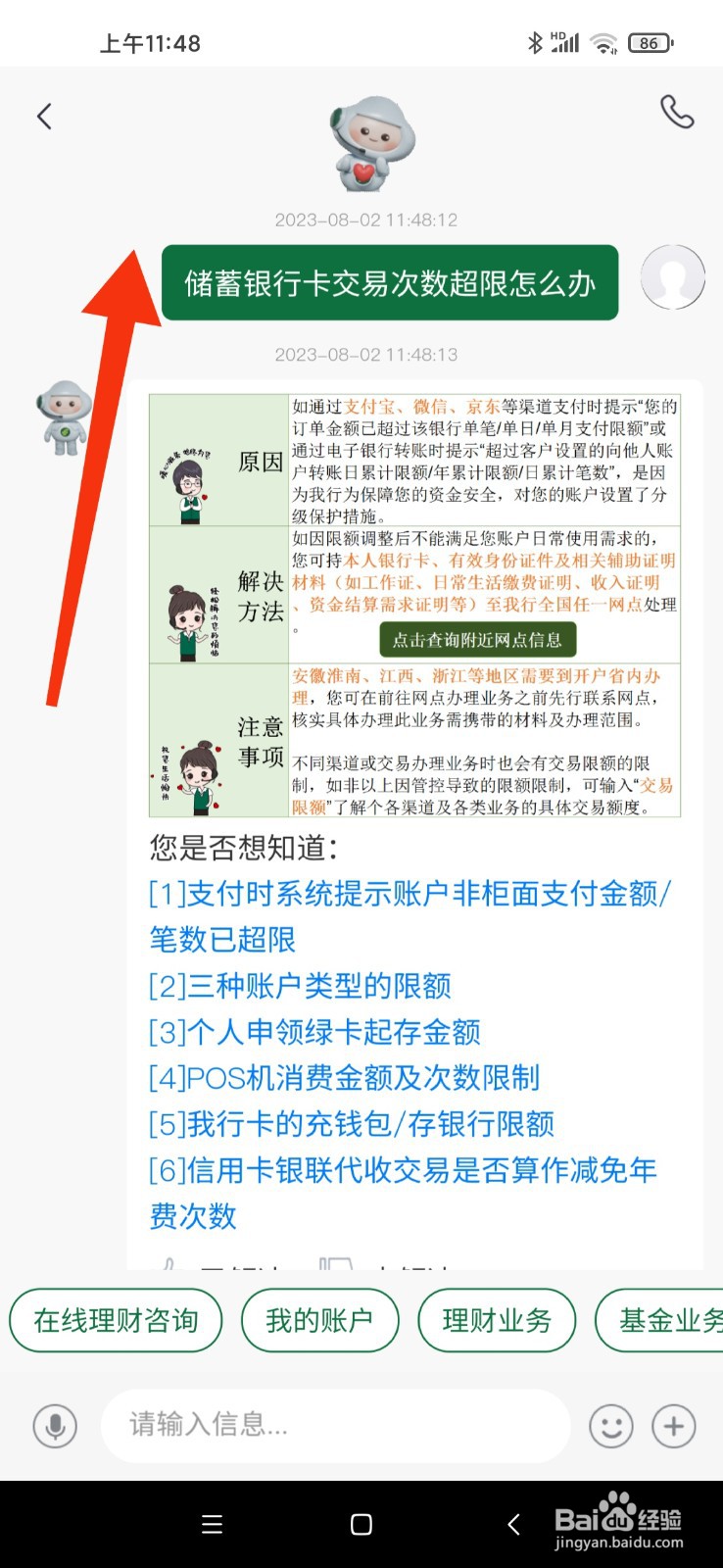 点击还有疑问?点我咨询,如下图,发送储蓄银行卡交易次数超限怎么办,看到邮政银行客服的回复就知道了