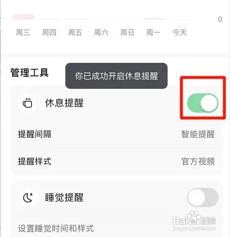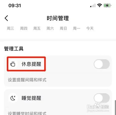 在时间管理页,找到“休息提醒”选项。