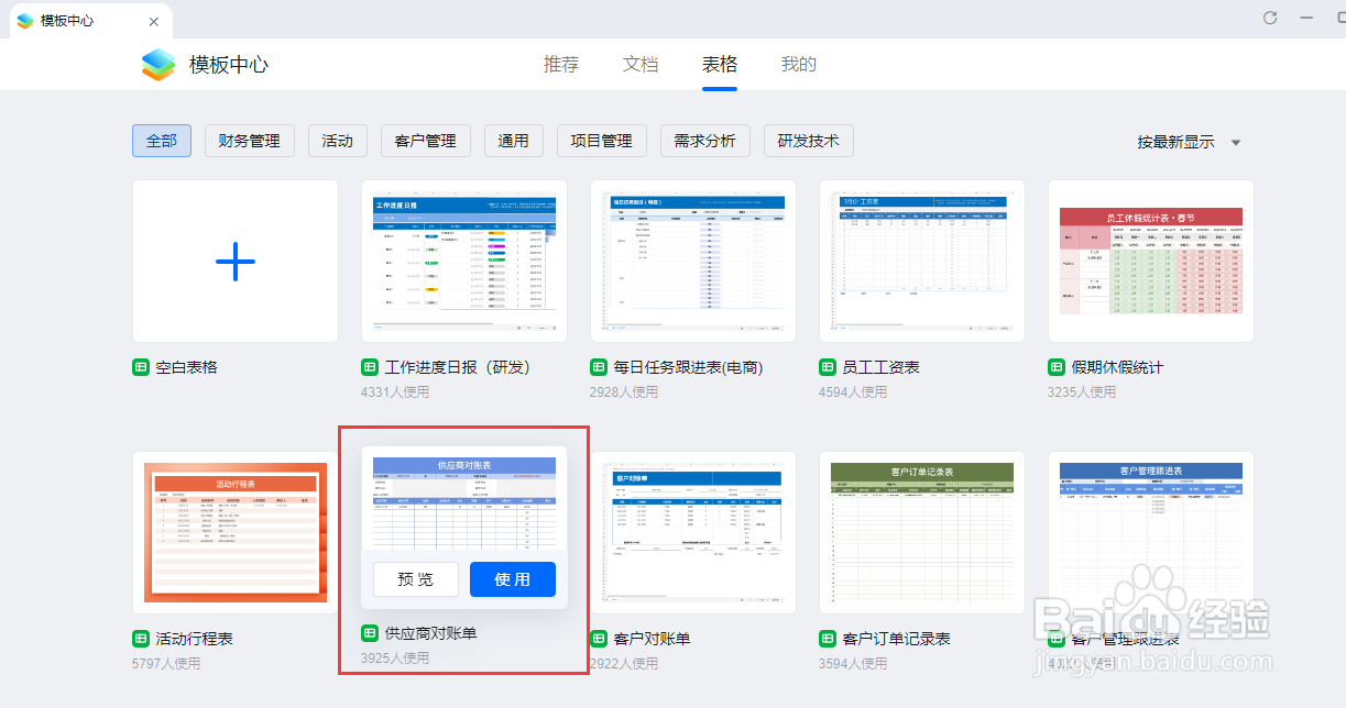 在文档模板中,选择员供应商对账表按钮,点击使用按钮