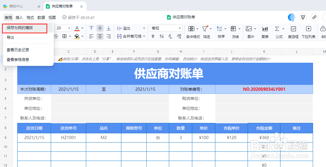 添加供应商单位、地址联系人和基本货物信息,点击左侧的保存为我的模板按钮