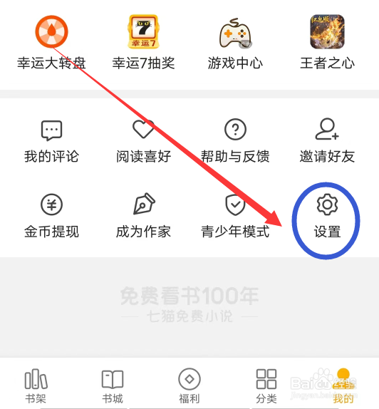 第一步:打开7猫免费小说APP,我的界面选择【设置】