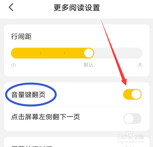 第三步:进入更多阅读设置界面,选择【音量键翻页】打开滑块