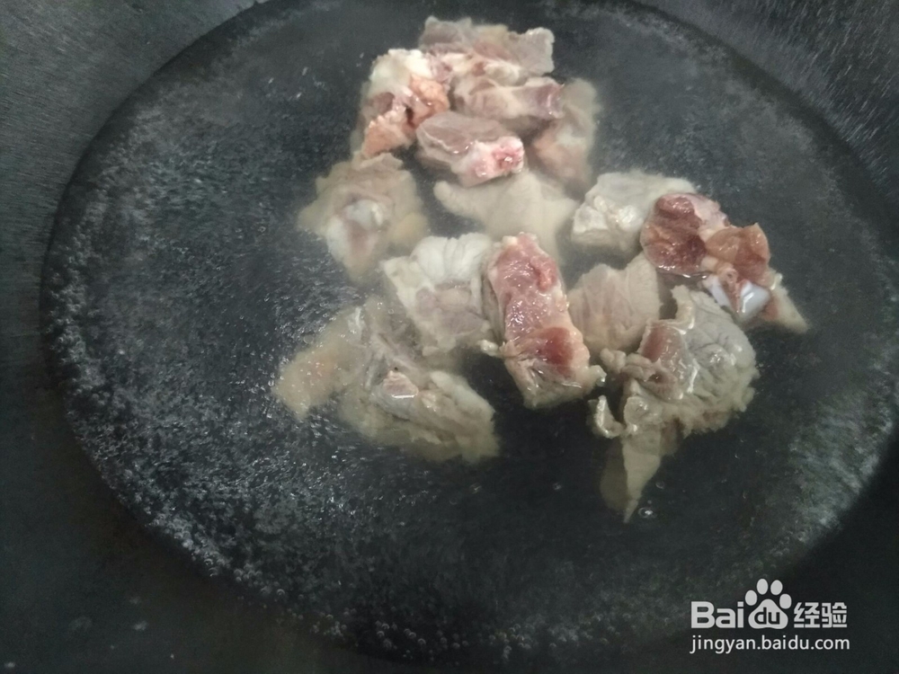 将买来的猪骨头清洗干净,在锅里放入适量的水,待水烧开后, 放入猪骨头,再次煮开,去掉血沫,然后捞出来,滤干水分。