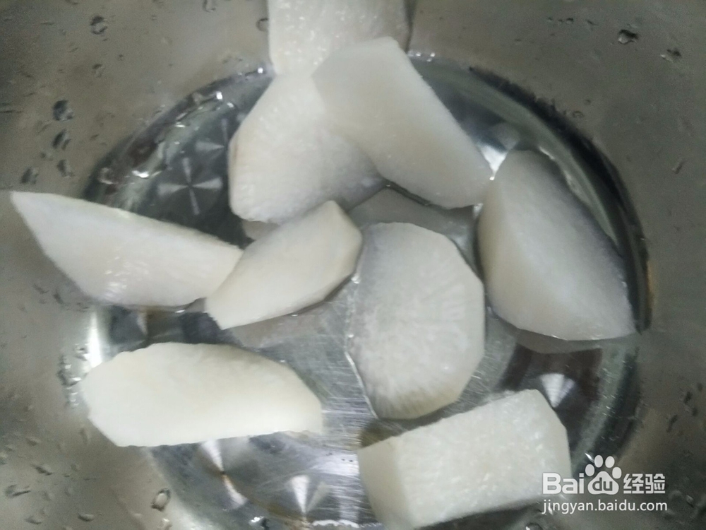 将白萝卜去皮清洗干净,然后切成小块,备用,要注意白萝卜,不要切太小块,不然很容易煲烂。