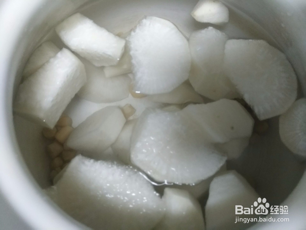 将白萝卜和瑶柱都放入汤锅中,然后往汤锅里加入适量的水。