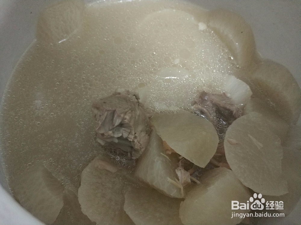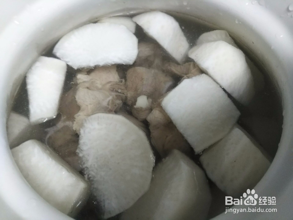 然后再加滤干水分的猪骨头加入有萝卜和瑶柱的汤锅中,然后开大火煲汤。