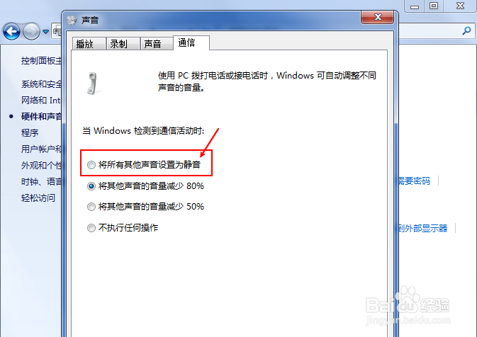 使用电脑时,有时候有通信电话打过来,想要把电脑其他声音设置为静音,那么在哪里设置通信时为静音,电脑怎么设置通话时其他声音为静音,为此本篇介绍以下方法。