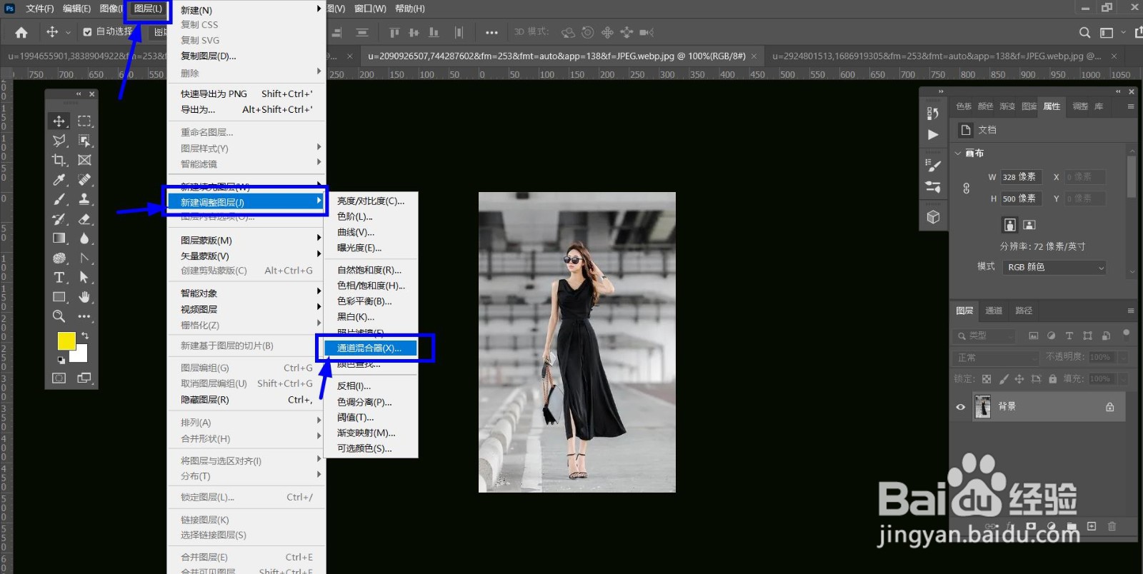 第2步:再在菜单栏中用鼠标左键依次点击【图层】-【新建调整图层】-【通道混合器】