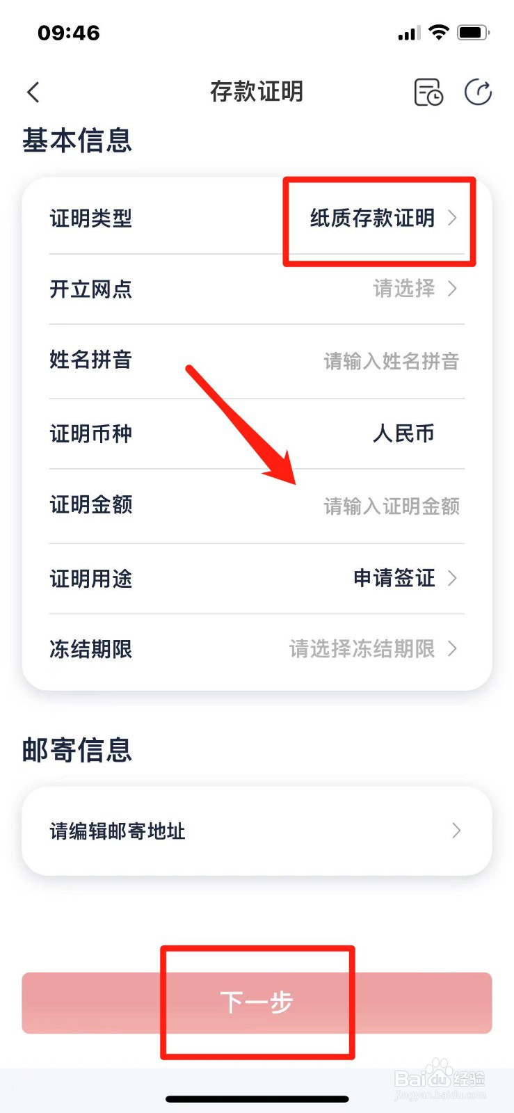 第三步:最后在存款证明页面,类型选择纸质存款证明,按要求输入相关信息,点击【下一步】进入即可申请。