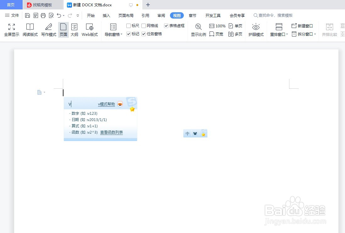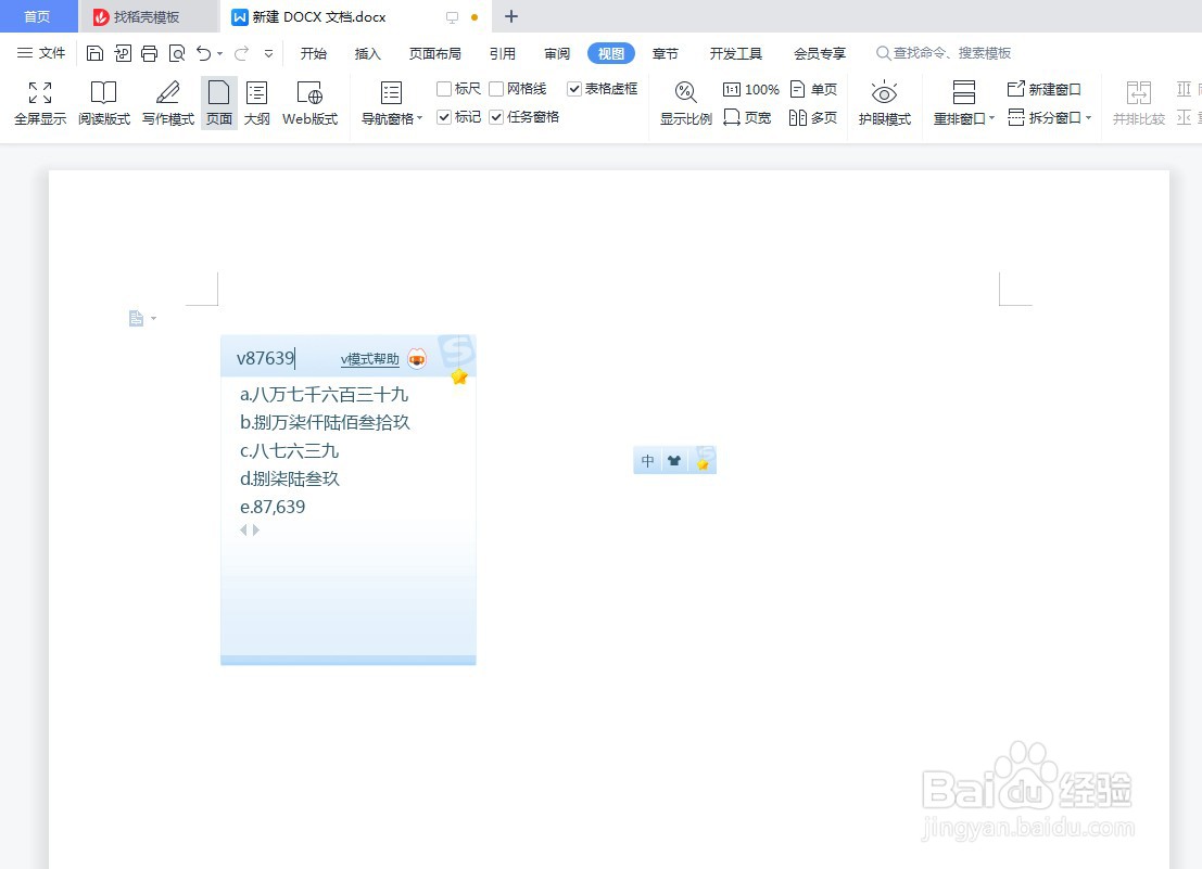 打开Word文档,以大写的“八万七千六百三十九”为例,我们在中文输入法的状态下先输入“V”