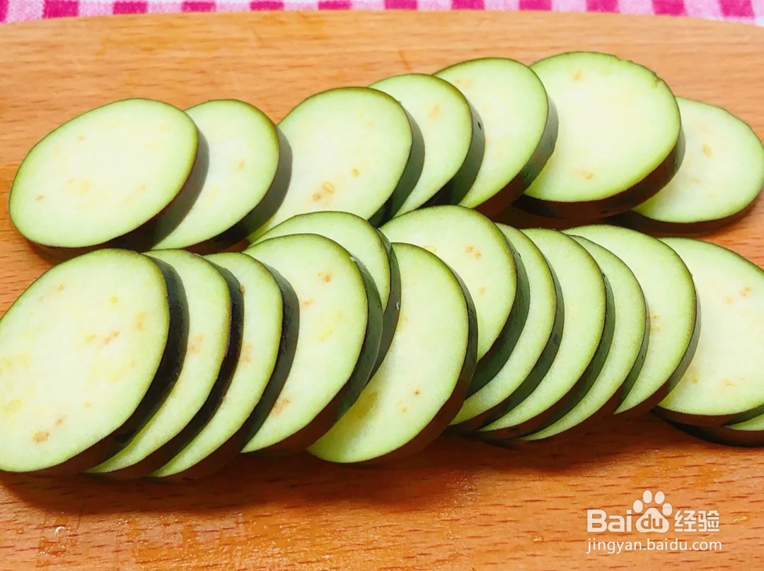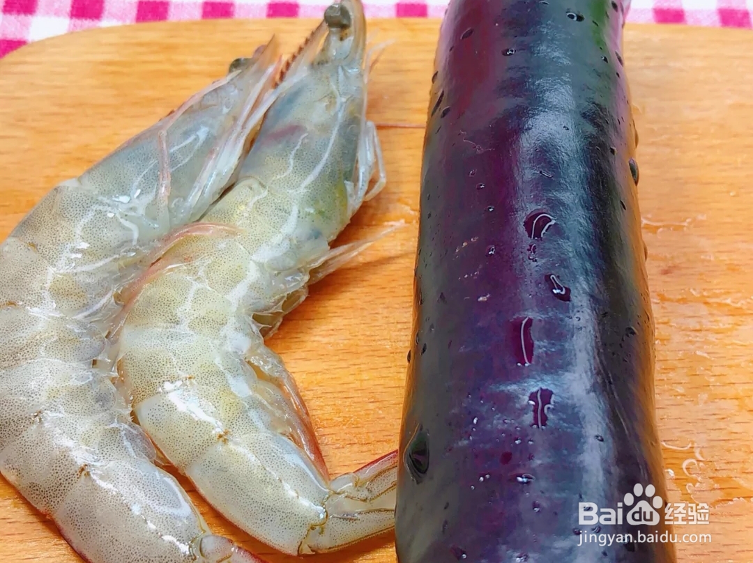 先把茄子洗干净切薄片,大虾处理干净切碎,备用。