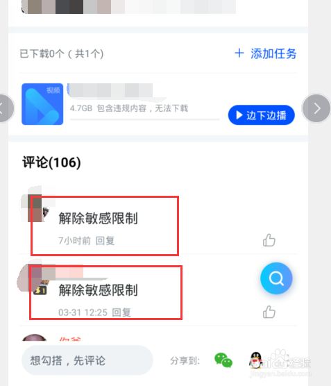 第三:下载速度为零并评论区有【解除安全/敏感限制】等评论。