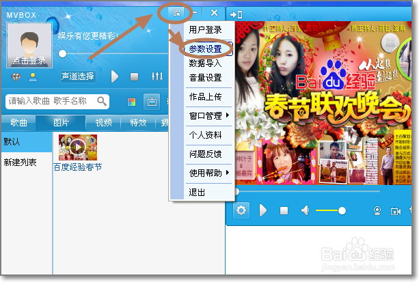 点击MVBOX顶上的功能菜单,选择参数设置。