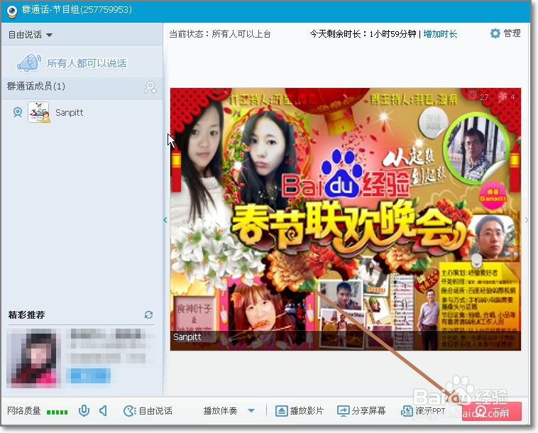 现在来看看效果吧,进入QQ群视频,点击上台就可以看到设置的QQ视频背景图片了,回到MVBOX开启本地摄像头,就可以看到你在背景的中间了。也可以在MVBOX上调试好本地摄像头再进行QQ视频。
