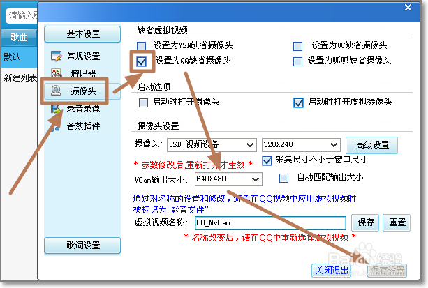 如图将在摄像头中,将设置为QQ缺省摄像头打勾。也可以选择视频输出大小,若摄像头是高清的,可以调大一点。