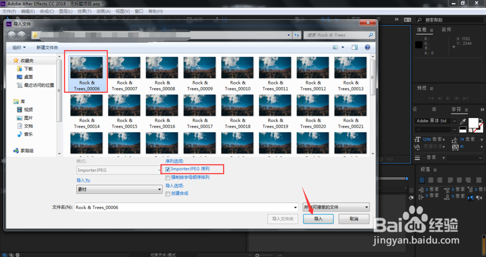 点击选中第一帧画面,勾选Importer.JPEG序列,点击导入