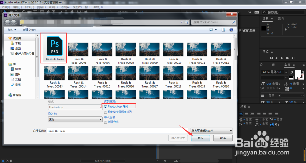 选中刚保持的psd文件,勾选Photoshop序列,点击导入