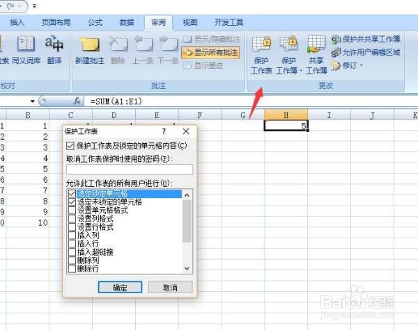 点击审阅菜单中的保护工作表,输入或者不输入密码,点击确定: