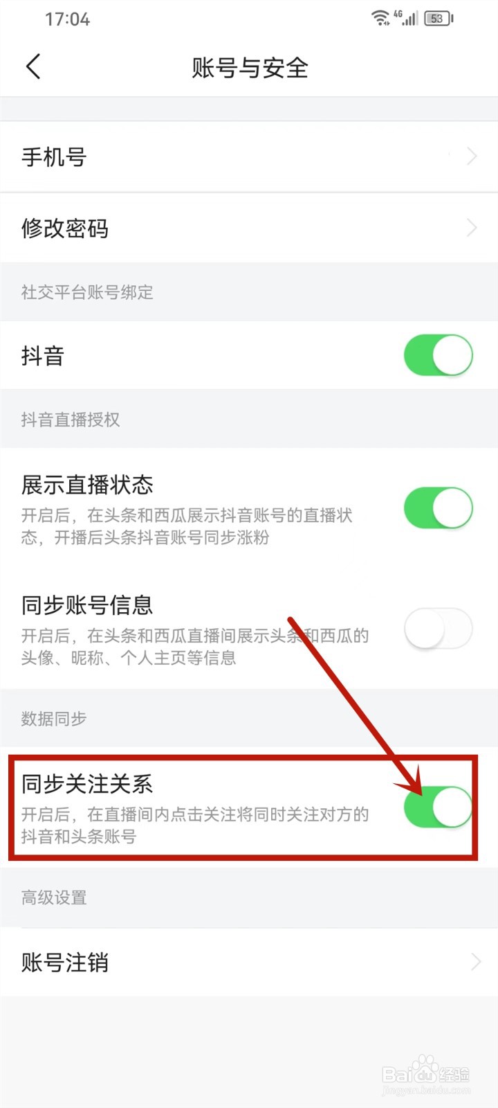 进入账号与安全页,打开“同步关注关系”开关,即可同步抖音关注关系。