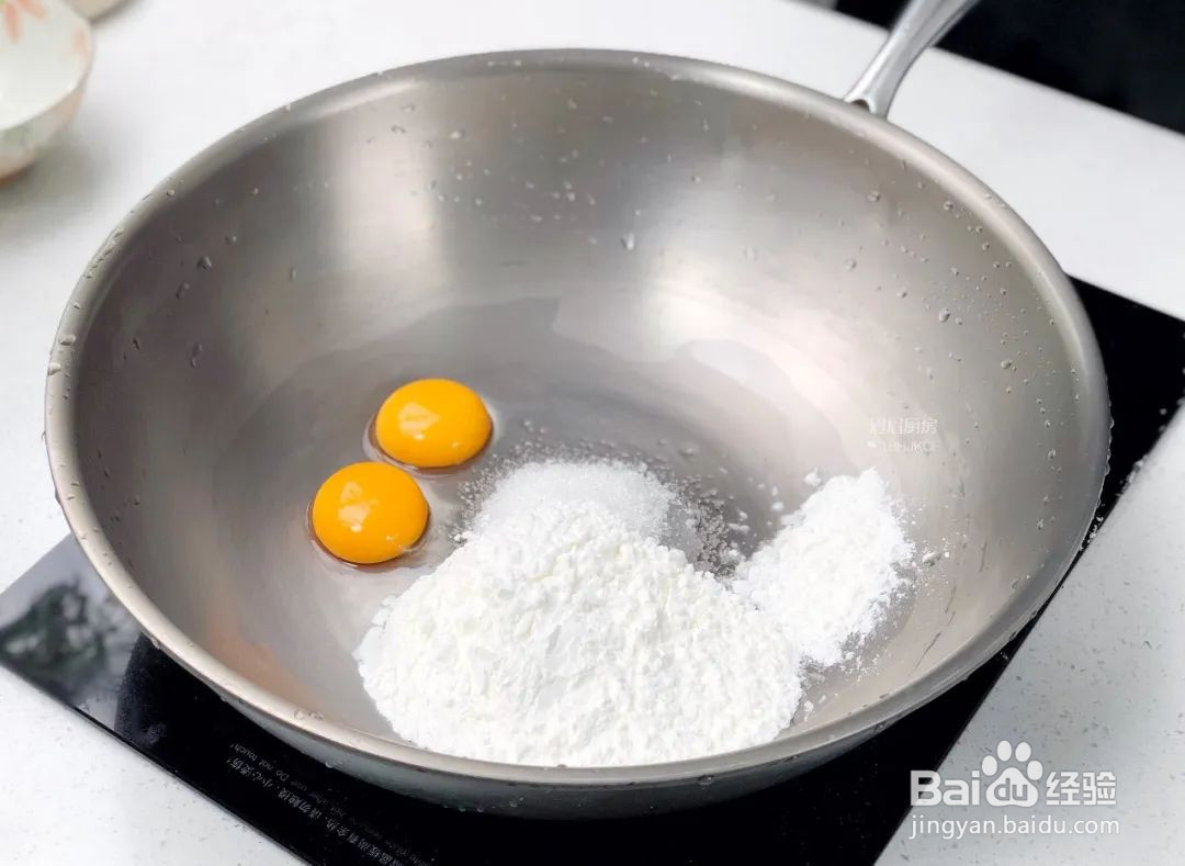 鹅妈妈钛晶锅打入2个蛋黄、30克白糖、60克淀粉(比例一定要对哦);