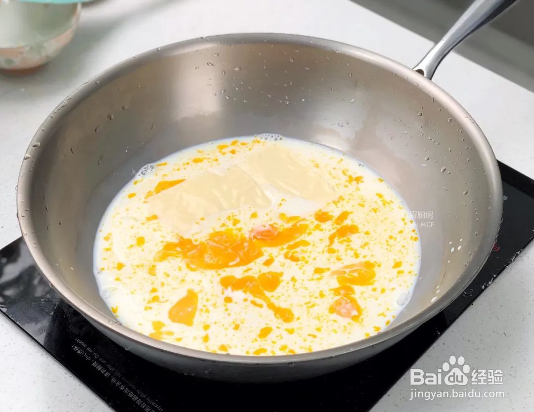 再倒入500ml纯牛奶、放入2片芝士;