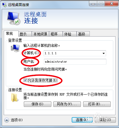 在“计算机”对应的编辑框中输入要登陆的远程计算机的ip地址,在“用户名”对应的编辑框中输入登陆远程计算机时的用户名,如果选择“允许我保存凭据”则下次打开远程登陆窗口时,不需要再次输入该计算机ip和用户名。然后选择连接