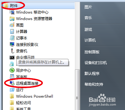 然后找到“附件”文件夹,点击该文件夹选择其下的“远程登陆桌面”工具