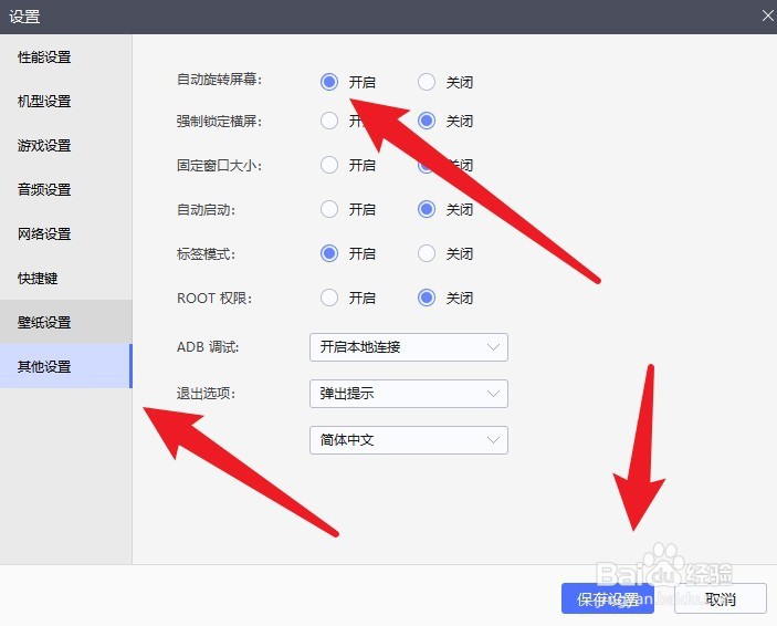 最后在软霸盆件设置界面, 点击其他设置下的开启自动旋转屏幕按钮,点击保存设置即可。