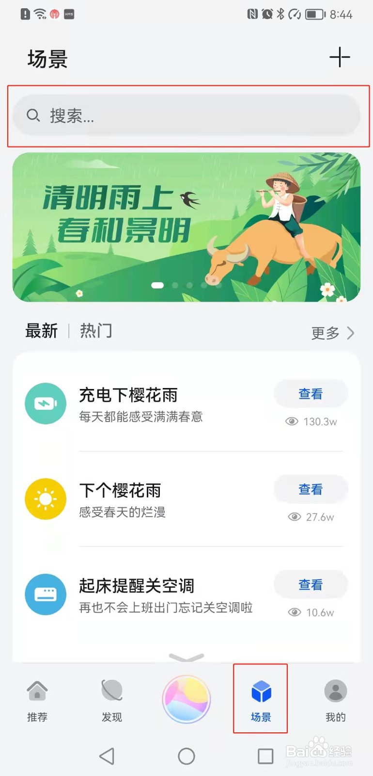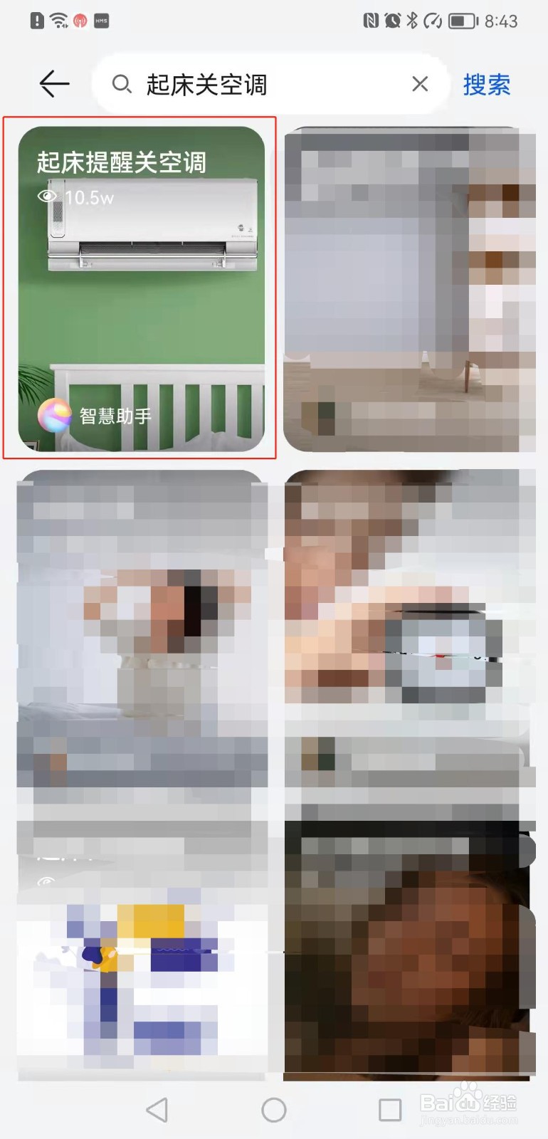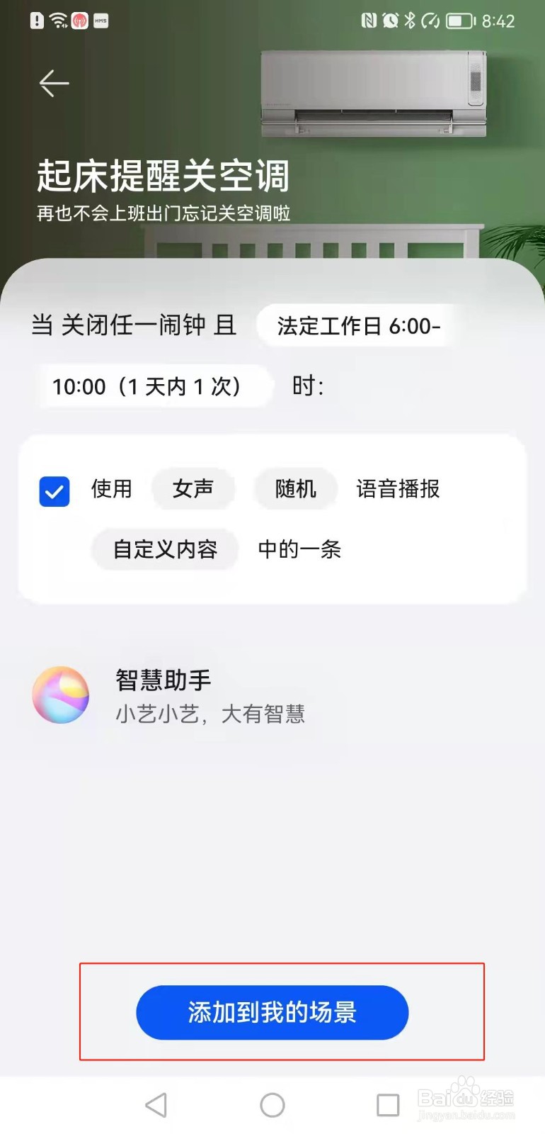 在智慧助手页面,底部选择场景,在搜索框内输入起床关空调。