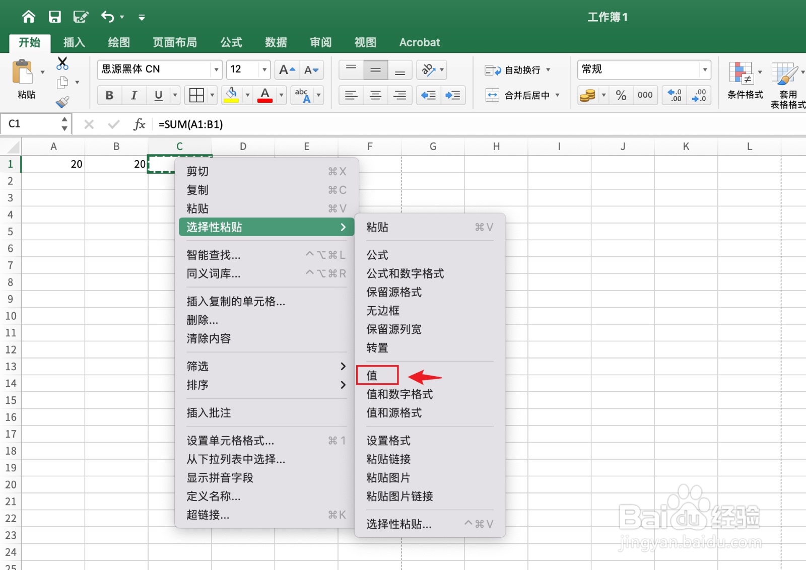 用鼠标右键找到选择性粘贴,光标右滑,点击【值】。