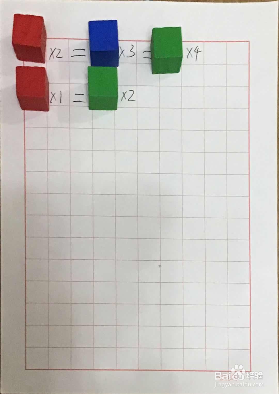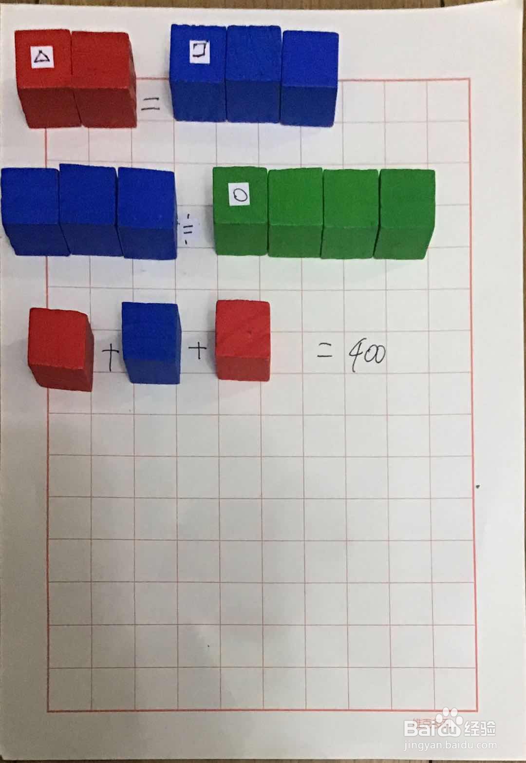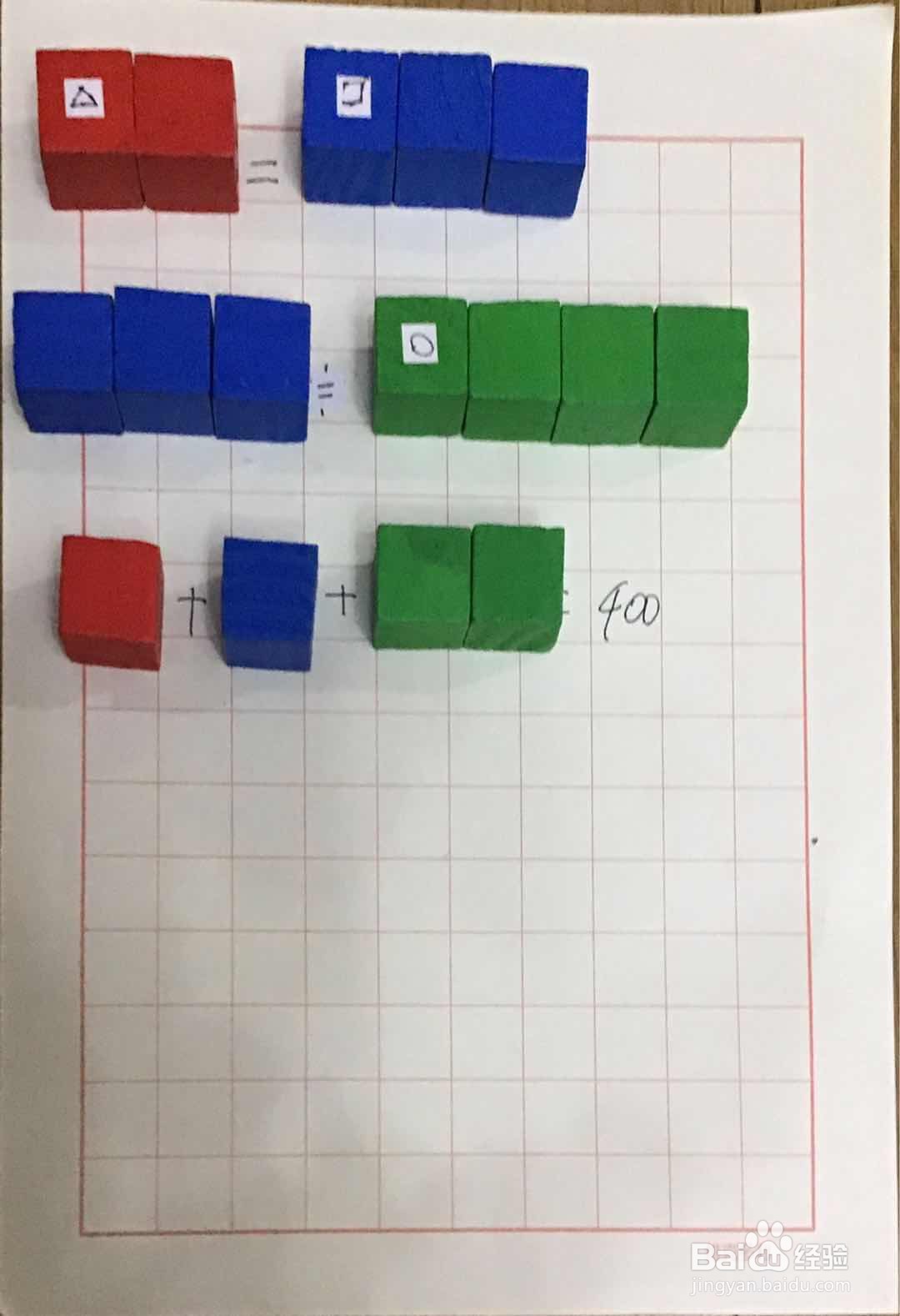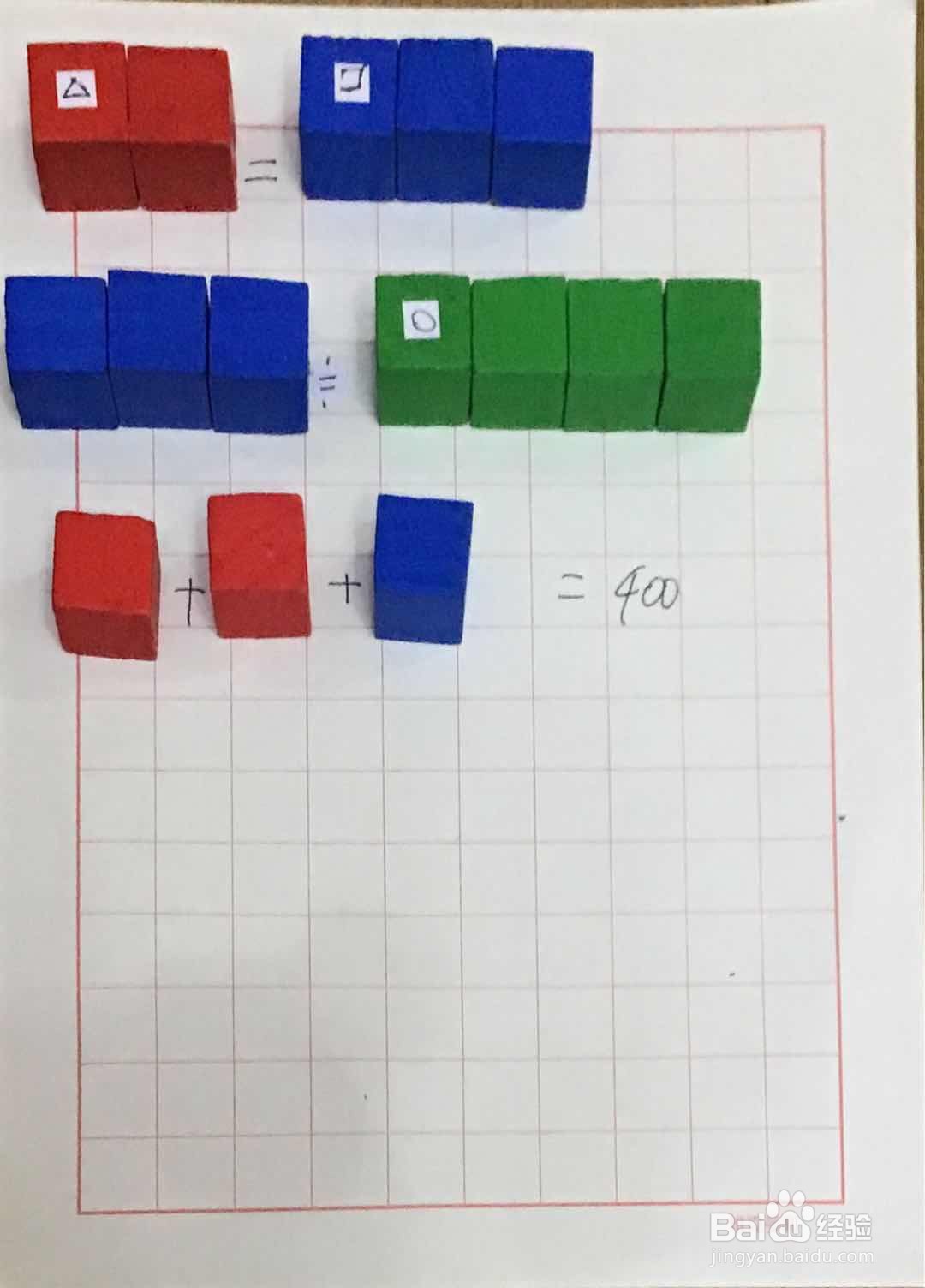 我手里没有那些图形,我用积木块来表示。我用小红(红色积木块)代表三角形,用小蓝(蓝色积木块)代表正方形,用小绿(绿色积木块)代表圆形。