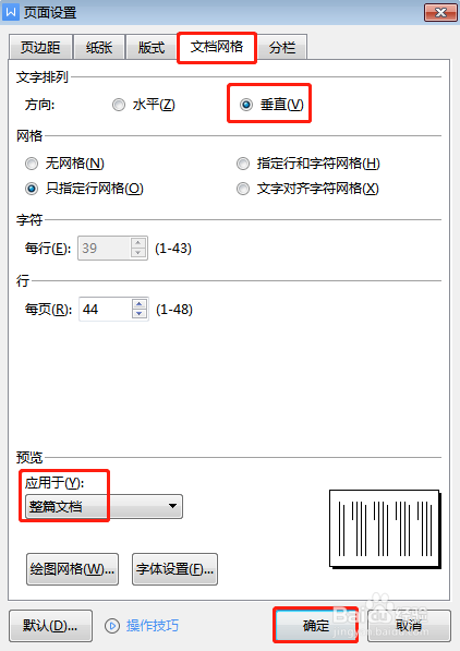 在打开的页面设置窗口,点击文档网格,勾选垂直选项,应用于整篇文档,点击确定。