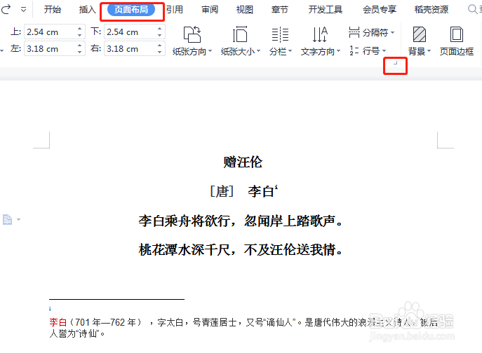 单击页面布局选项,在页面设置区域选择右下方的小三角,打开页面设置对话框。