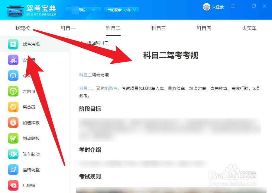 点击弹窗左上角的【驾考法规】,学习科目二驾考考规。
