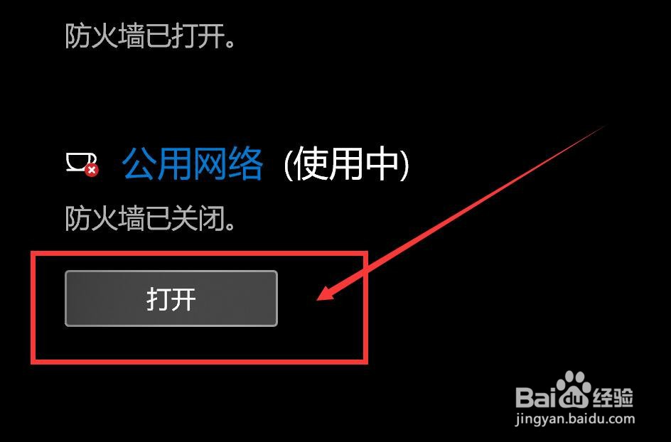 点击【公用网络】下方的【打开】即可开启防火墙。