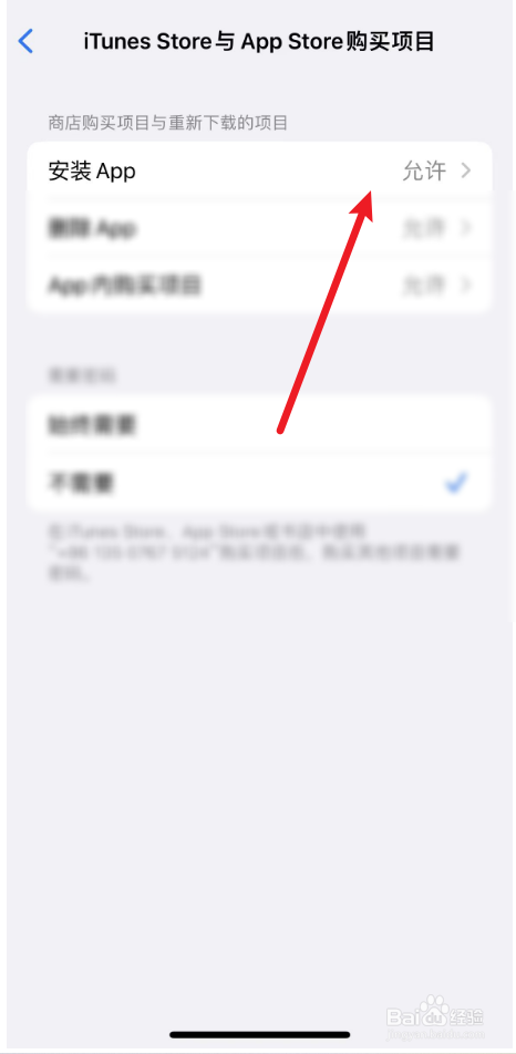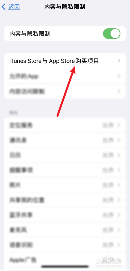 这内容与隐私限制页面中,点击iTunes Store与App Store购买项目。