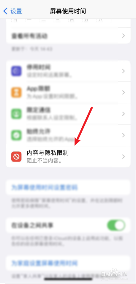 屏幕使用时间页面中点击内容与隐私限制。