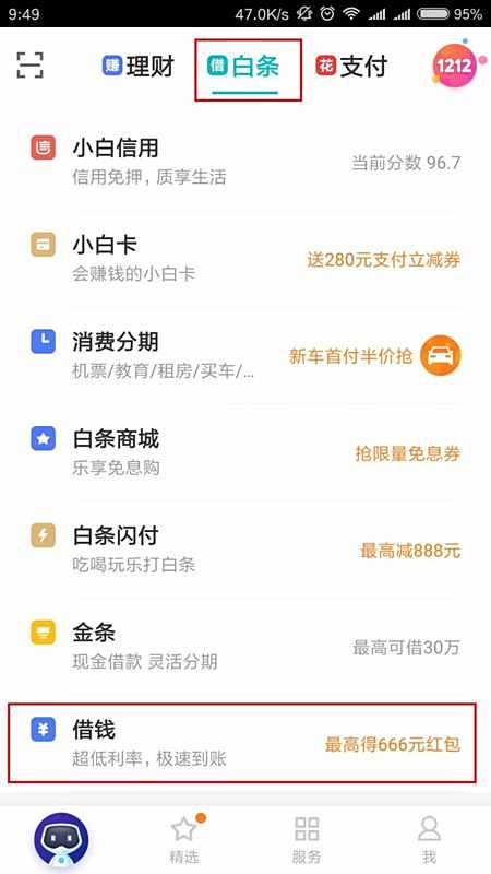 借钱入口:【京东金融App首页】-【白条】-【借钱】。