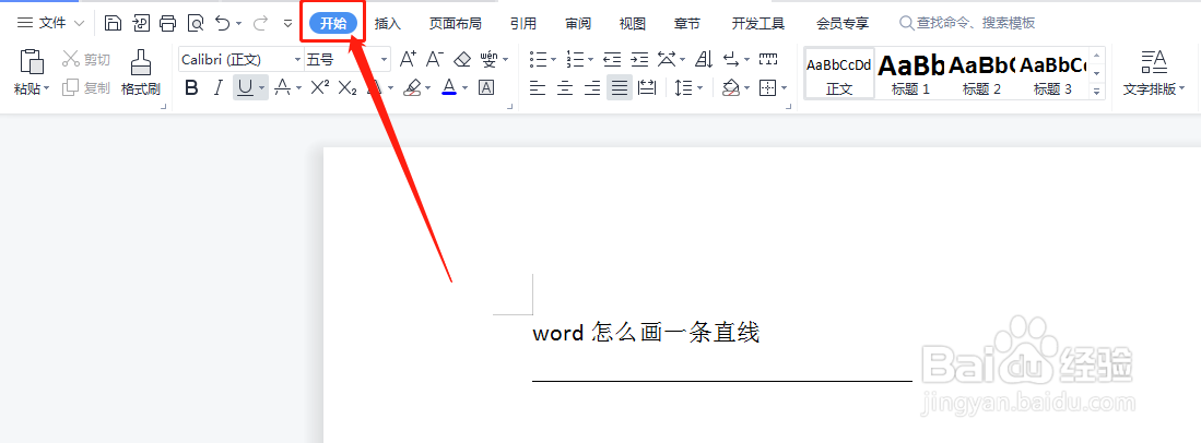 打开word文档,找到顶部菜单栏的“开始”选项,并点击选择它。