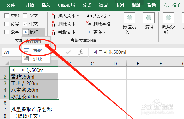 在本例中,字符串里有饮料名称和对应的毫升数,但是我们需要提取其中的饮料名称,我们可以这么做。打开Excel文件,点击”方方格子“选项卡。